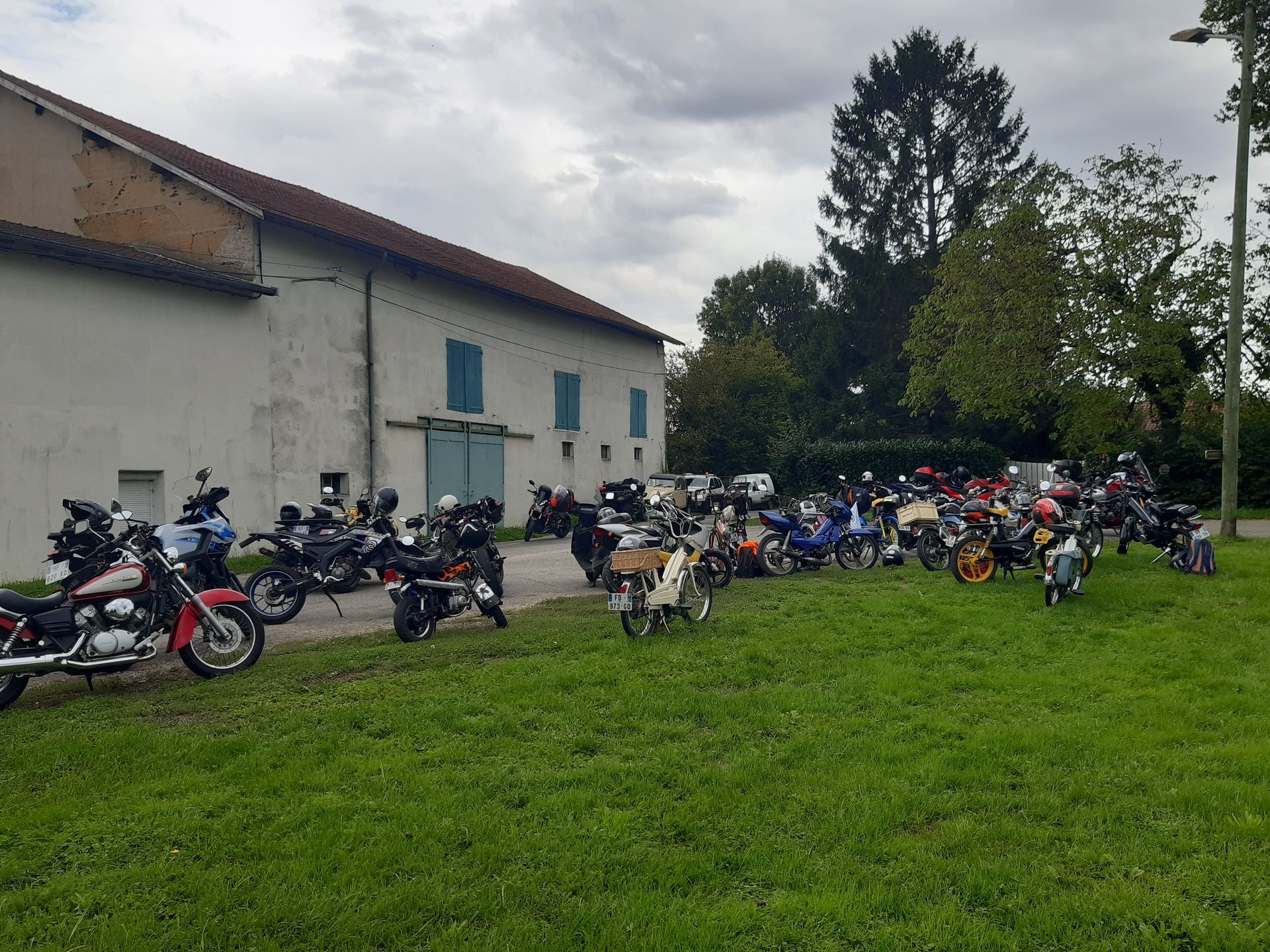 Pause saucisson sous les halls de Pisay, rassemblement de tous les deux roues pour le plus grand plaisir des passants, photo souvenir puis, les deux groupes se sont de nouveau séparés pour le retour à Chalamont.
